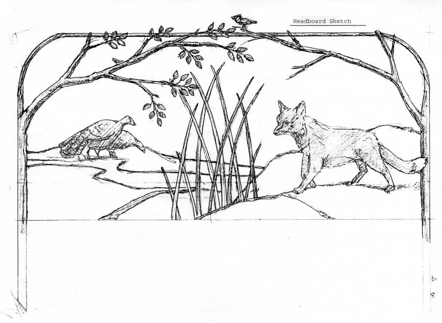 The sketch of a custom headboard with a fox and turkeys that were details the client wanted to incorporate into the design.