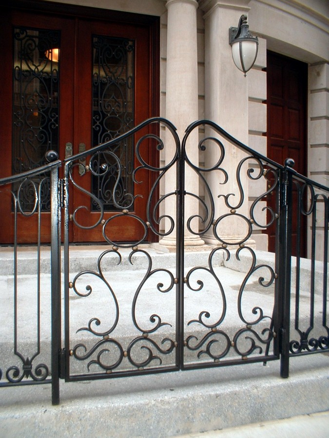 We custom fabricated a complete custom wrought iron gating package, including the arched top iron gate, contiguous entryway fencing and iron door grilles for a double set of plate glass wooden doors.