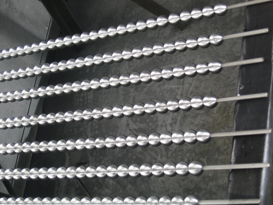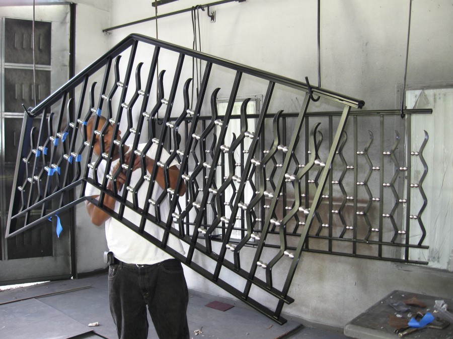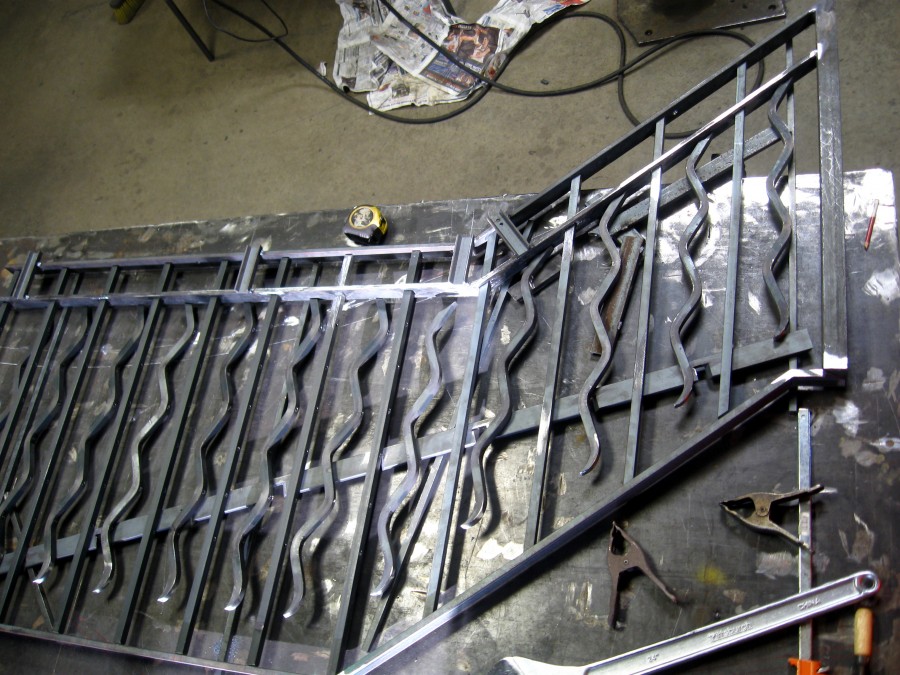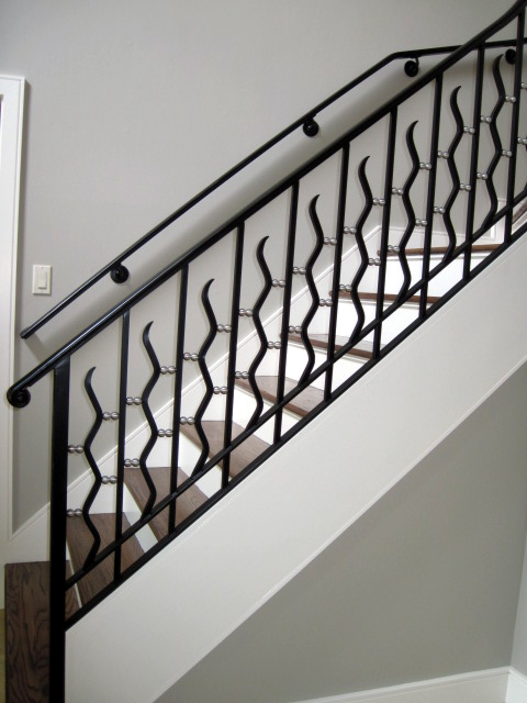 Ornamental iron railings with wavy pickets and balls. As seen above, stair case, landing.
