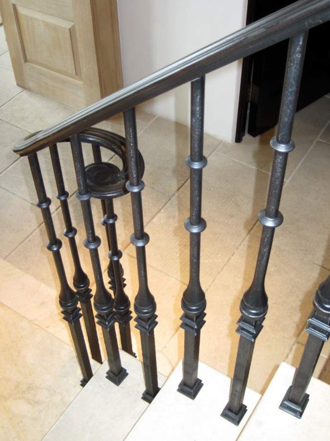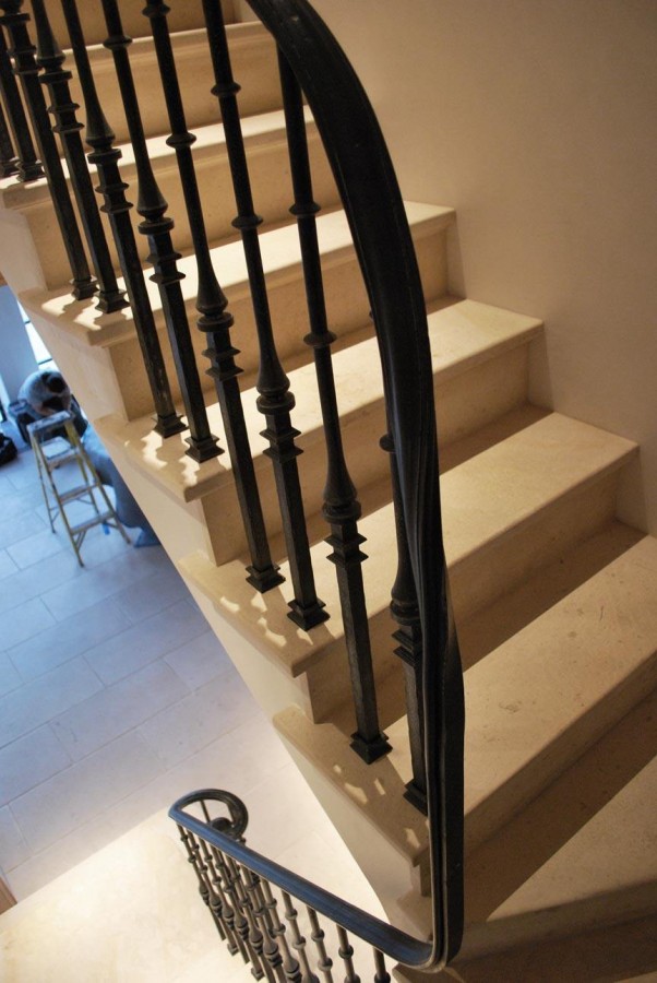 We custom fabricated this entire railing to make it look older. The client had a specific idea of what they were looking for in a picket style being square on the bottom and round on the top. The pickets were made in 2 seperate pieces and then put together. The pickets needed to look old like they had been there forever, so guys in the shop heated each one which is called scaling. The scaling causes the metal to flake off giving a worn apearance. The black paint was applied then scuffed off giving a rustic look to each picket. The picket started out as a wood prototype that was approved by the client and then went into production.