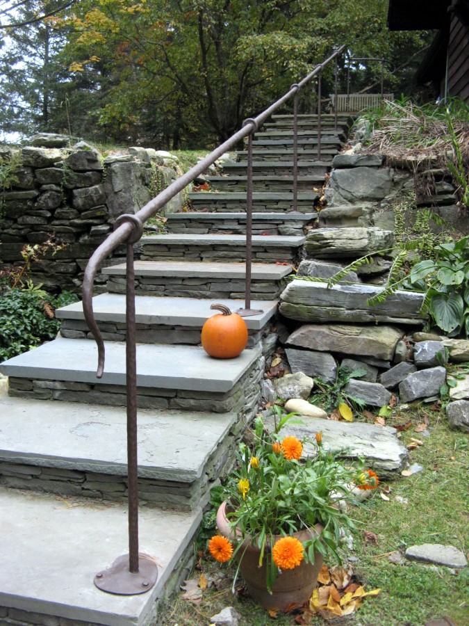 This entry railing was made from hammered textured steel pipe and solid round stock. The vertical posts and hand rail terminations were tapered for added visual interest. The base plates were engineered to increase the stability of the rail as well as to fit into the overall organic design.
