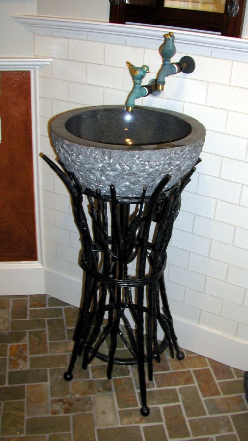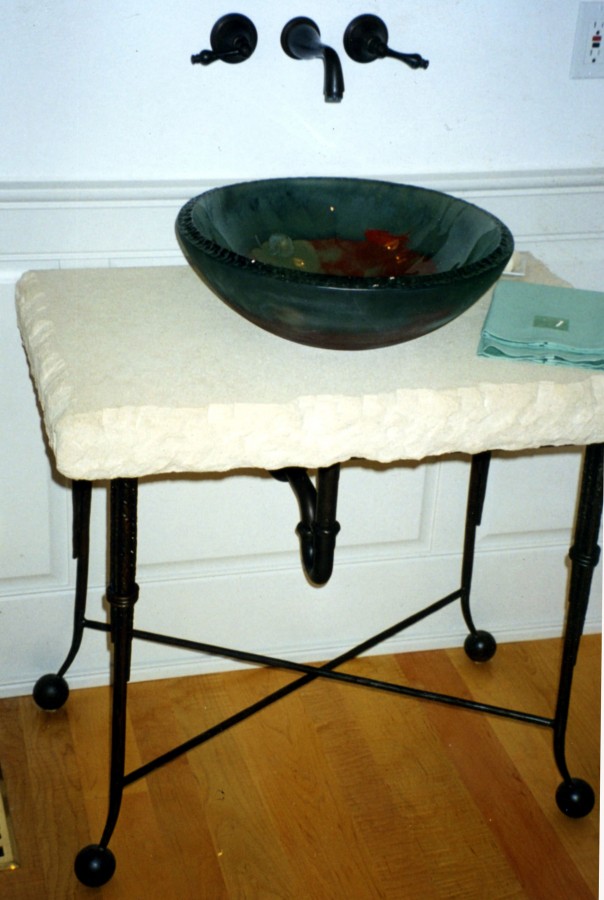As you can see, sink stands and counter tops can be custom fabricated to fit with any decor. They can be very simple or very elaborate. As shown above, a custom steel countertop and mounting brackets, painted then clear coated. The basin was supplied by the client and the colors were chosen to match.