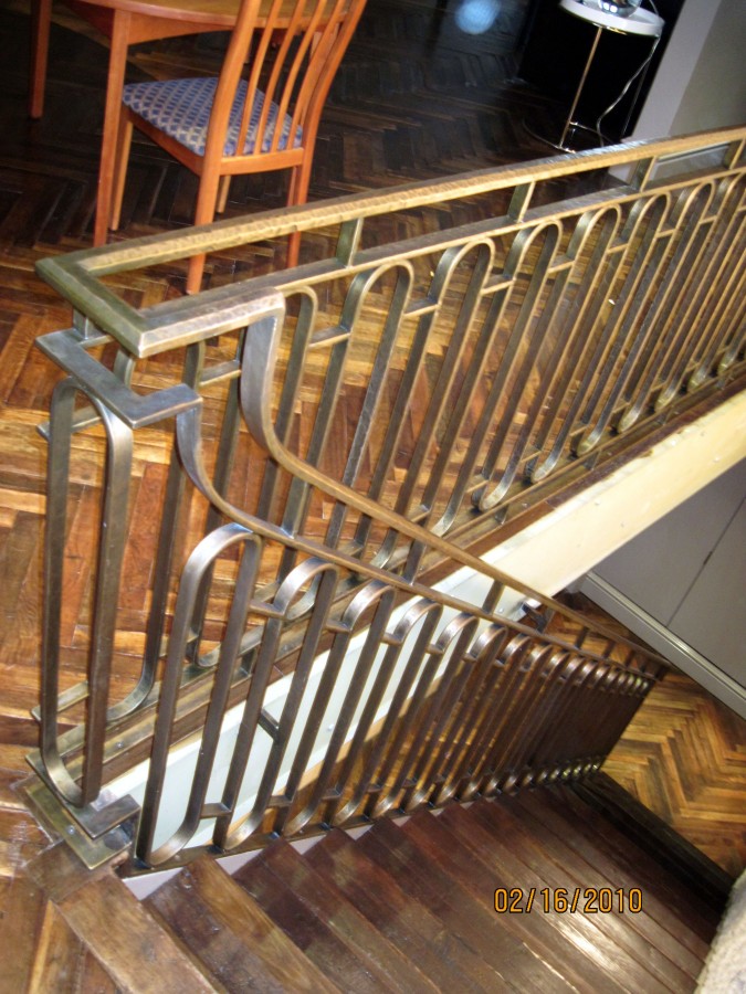 Hand Forged Bronze Oval Hammer Textured Railing. As seen above, stair and landing section.