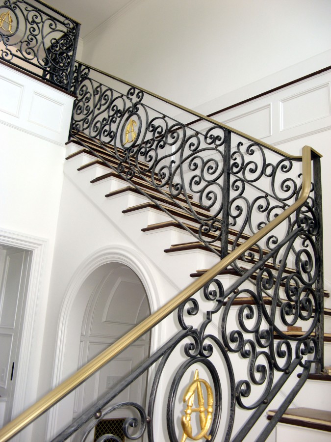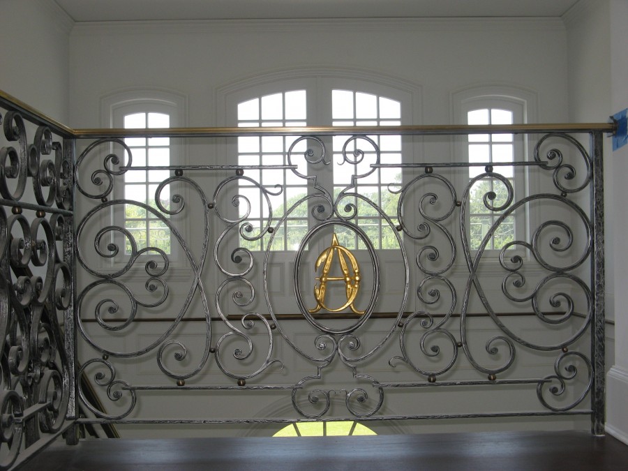 This railing was fabricated from steel that was heated in the fire then formed around jigs of various sizes to create each scroll. The customer wanted their initials in each of the 8 rail panal so custom ovals and letters were made to fit into each section of railing. The initials were gold leafed to match the bronze details and were the last thing to be installed. The rail was painted black then the paint was sanded off in certain areas to let the silver color of the steel show through and give the rail a more aged look. Once the coloring was achieved the rails were clear coated and the initials were installed. Each stair and landing was a different size so a template was made for each panel. The scroll pattern stayed uniform but the sizes of the scrolls had to be adjusted in size to keep the pattern uniform through out.